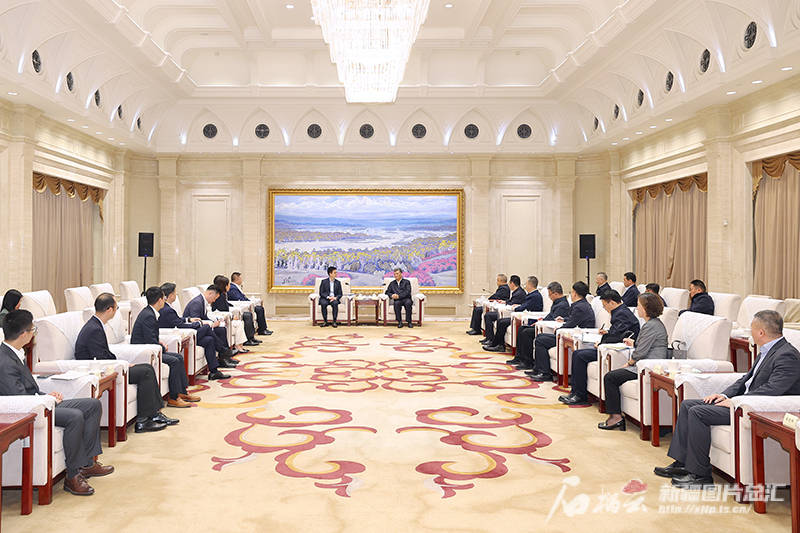 4月28日,自治区党委书记马兴瑞、自治区主席艾尔肯·吐尼亚孜在乌鲁木齐会见国泰集团行政总裁林绍波一行。石榴云/新疆日报记者 崔志坚摄