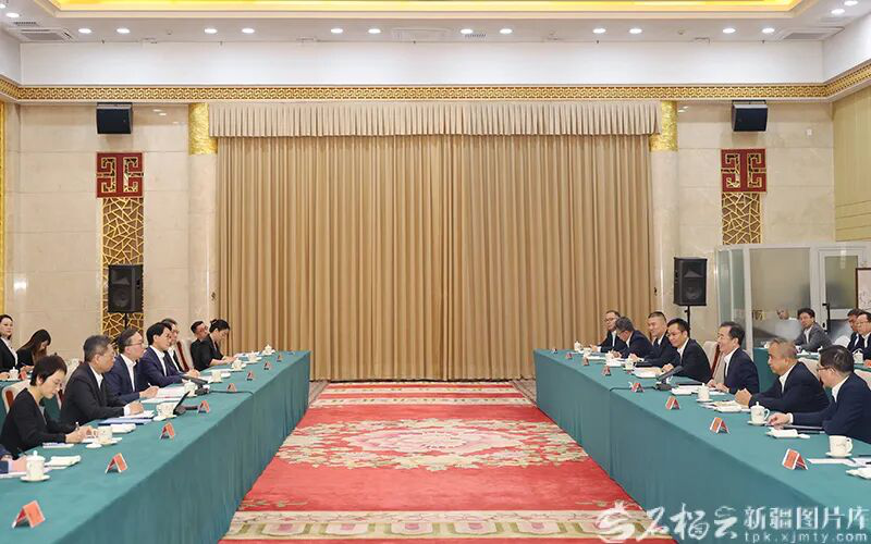 9月12日,自治区党委书记陈小江,自治区党委副书记、自治区主席艾尔肯·吐尼亚孜在乌鲁木齐会见香港特别行政区政府律政司司长林定国一行。石榴云/新疆日报记者 崔志坚摄