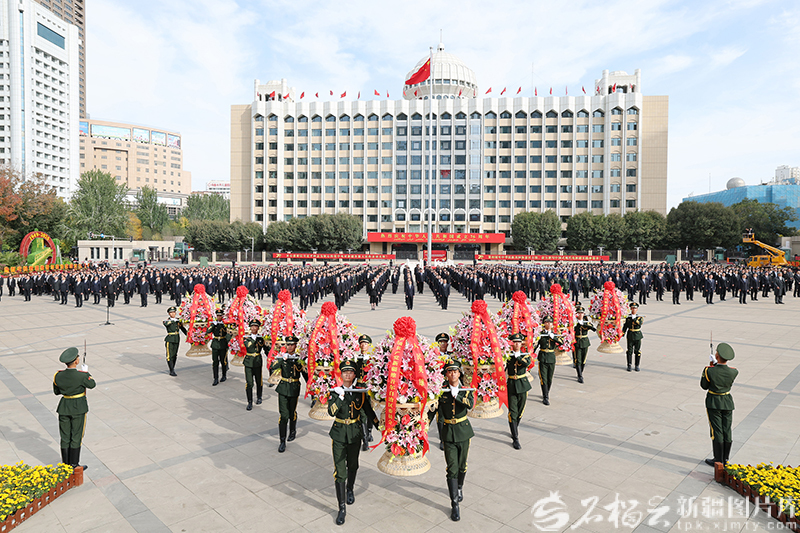 乌鲁木齐人民广场庄严肃穆,中国人民解放军进军新疆纪念碑巍然矗立。纪念碑正前方,排列着以自治区党委,自治区人大常委会,自治区人民政府,自治区政协,新疆军区,新疆生产建设兵团,各民主党派、自治区工商联和无党派人士,乌鲁木齐市各族各界群众,少先队员名义敬献的9个花篮。各族各界代表整齐列队,向人民英雄致以崇高敬意。