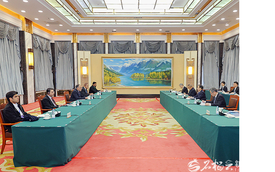 12月2日,自治区党委书记陈小江、自治区主席艾尔肯·吐尼亚孜在乌鲁木齐会见巴基斯坦规划、发展与特别倡议部部长阿赫桑·伊克巴尔。石榴云/新疆日报记者 崔志坚摄