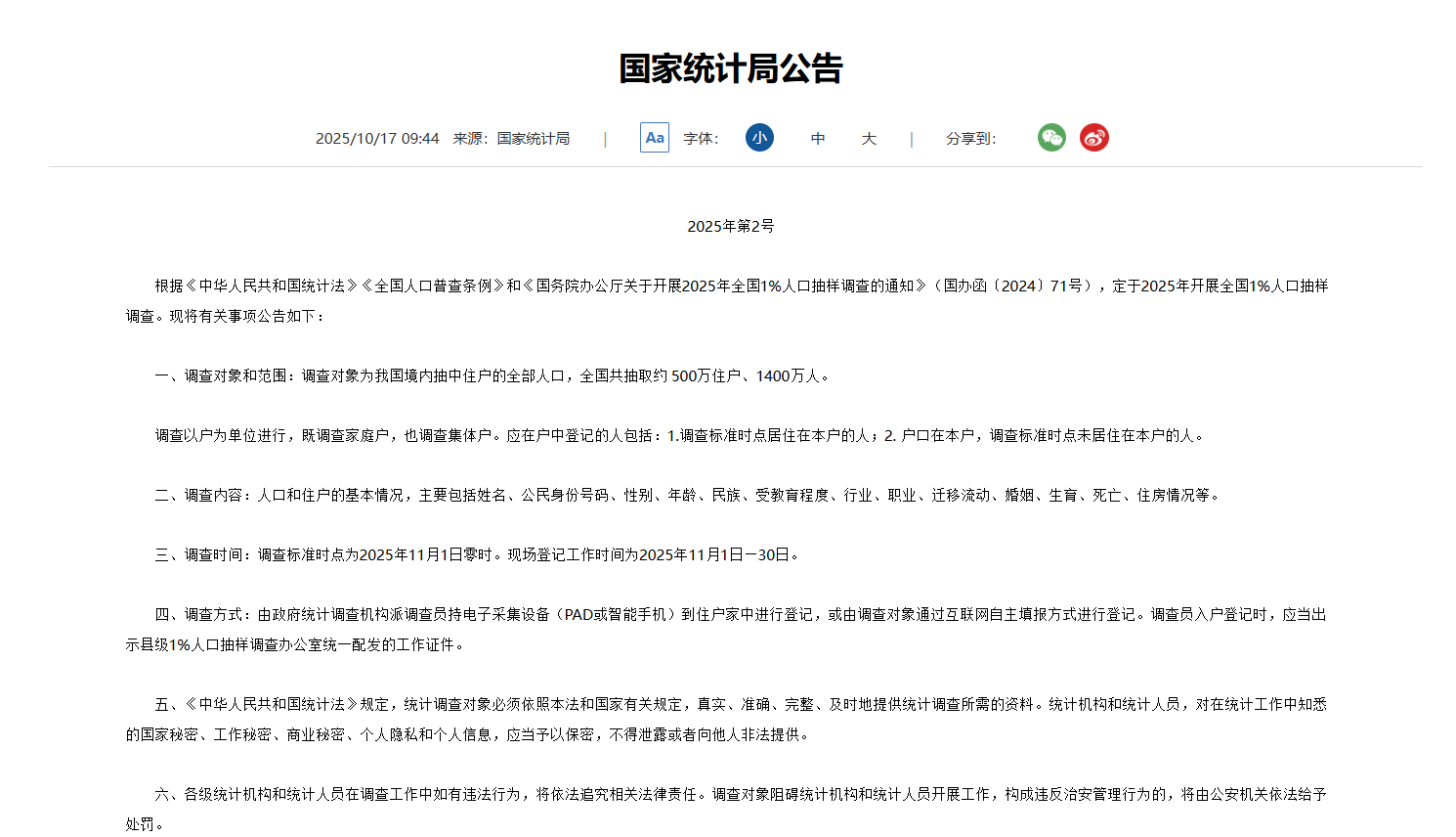 根据《中华人民共和国统计法》《全国人口普查条例》和《国务院办公厅关于开展2025年全国1%人口抽样调查的通知》(国办函〔2024〕71号),定于2025年开展全国1%人口抽样调查。现将有关事项公告如下: