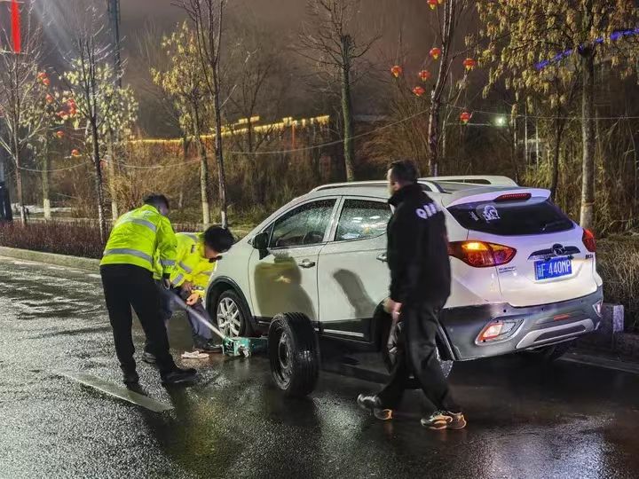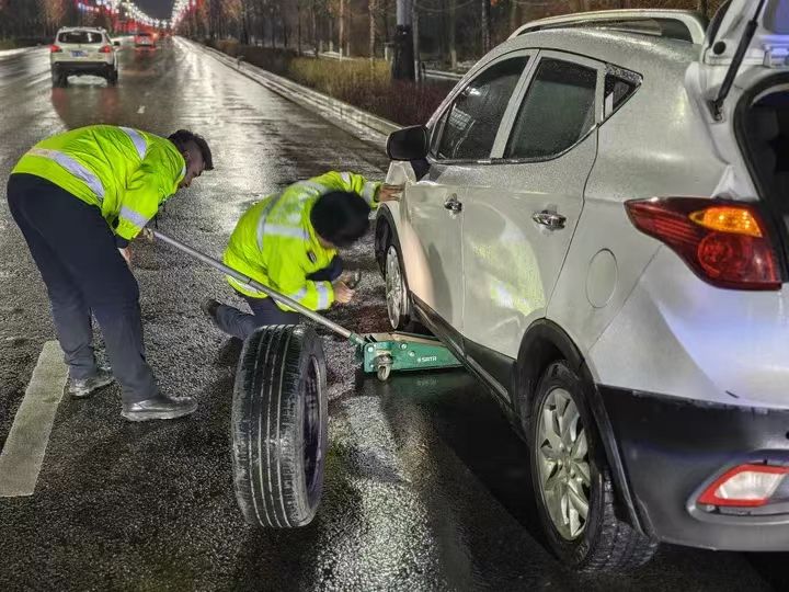 了解情况后,民警第一时间在故障车辆来车方向规范摆放三角警示牌,做好现场安全防护,引导过往车辆减速避让,严防发生二次交通事故。随后,民警拿出随车工具,不顾冬日严寒与轮胎上的污渍,熟练地支起千斤顶、卸下破损轮胎、安装备胎、紧固螺丝,一系 列动作有条不紊、快速高效。