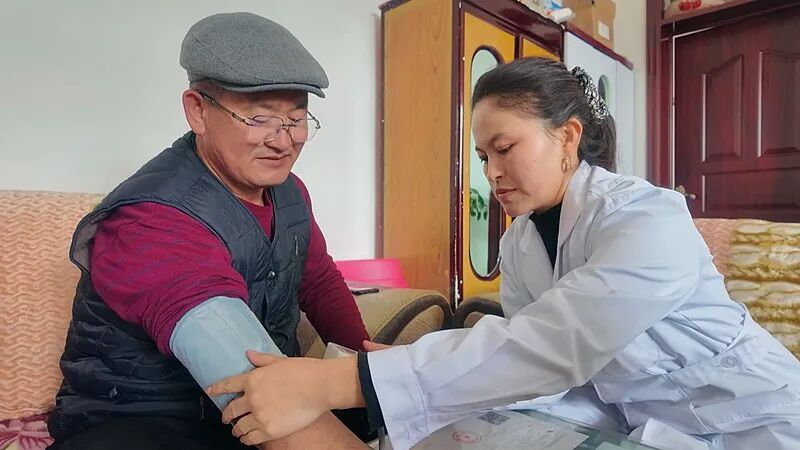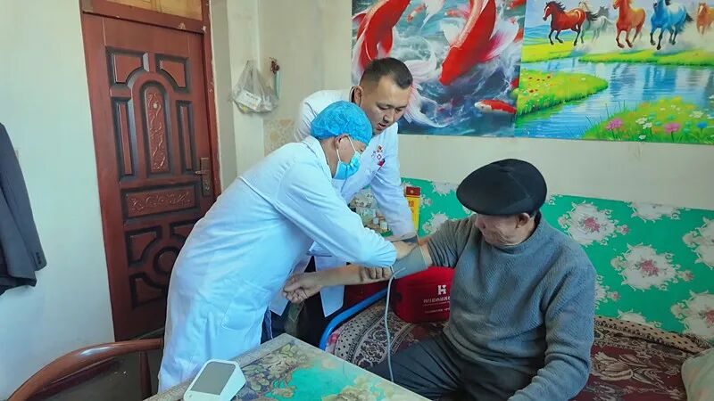 在塔斯托干村村民薛德胜家中,家庭医生为他测量血压,详细询问近期用药情况,并现场调整治疗方案。同时,还嘱咐他日常饮食要少油少盐,注意保暖,避免因气温变化引发血压升高。