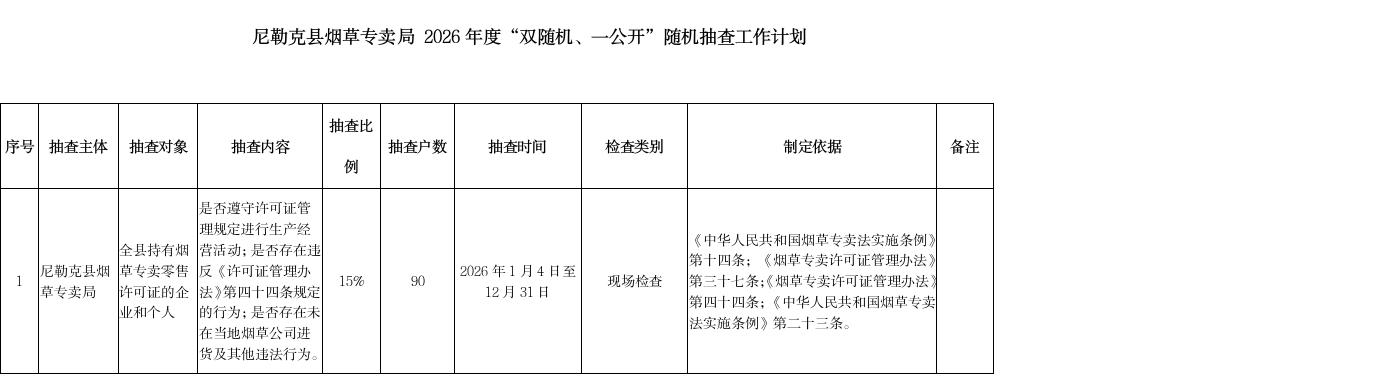 尼勒克县烟草专卖局2026年度“双随机、一公开”随机抽查工作计划