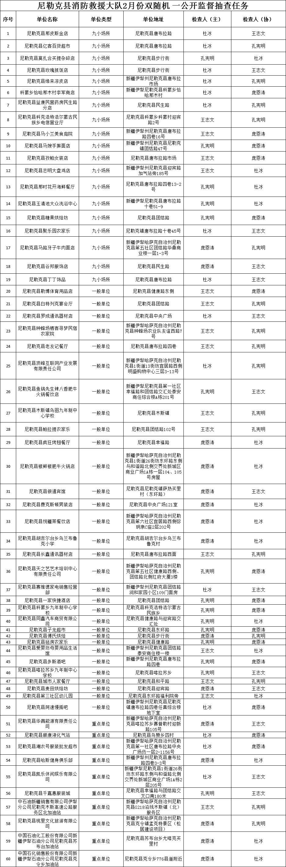 尼勒克县消防救援大队2月份双随机 一公开监督抽查任务