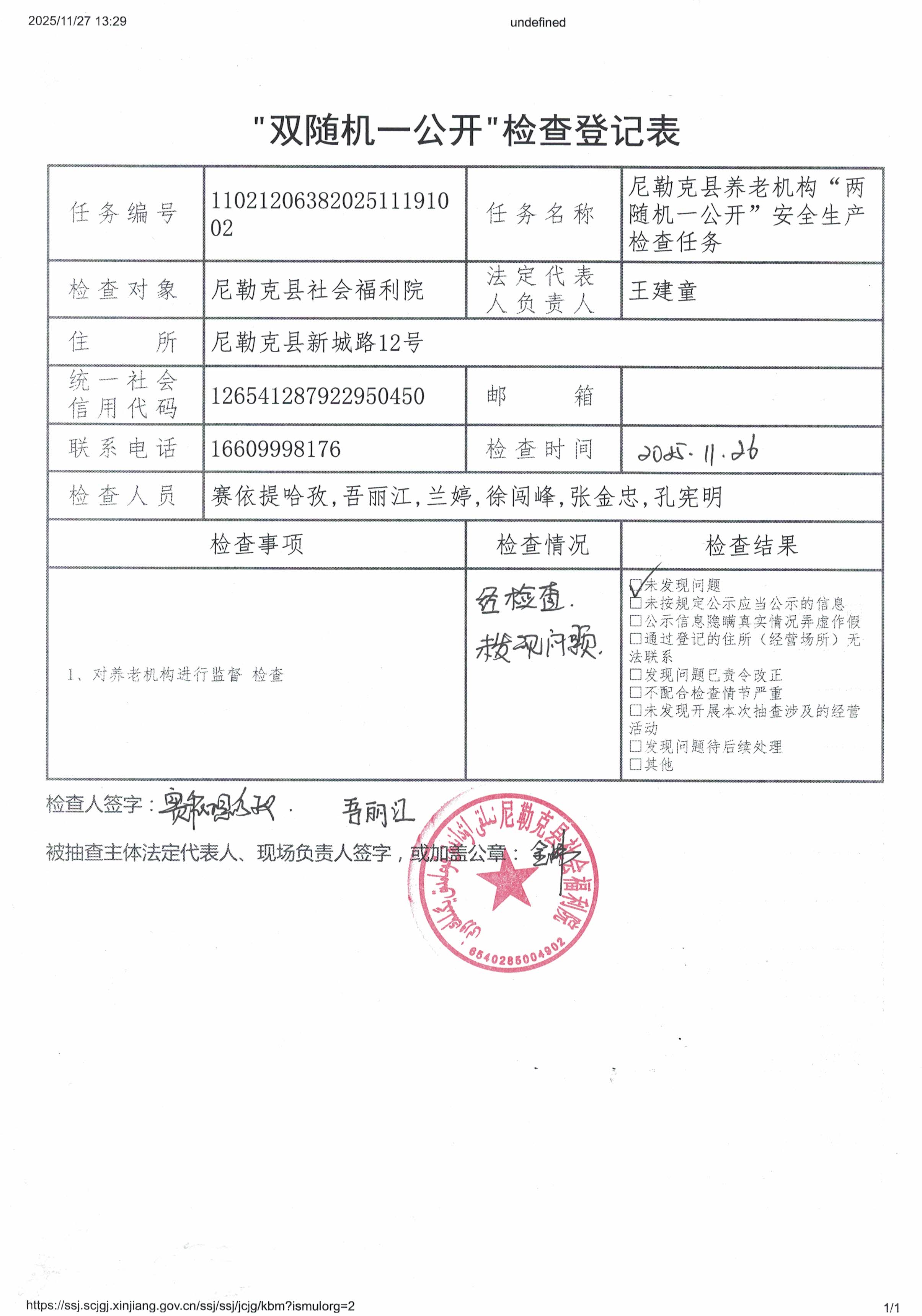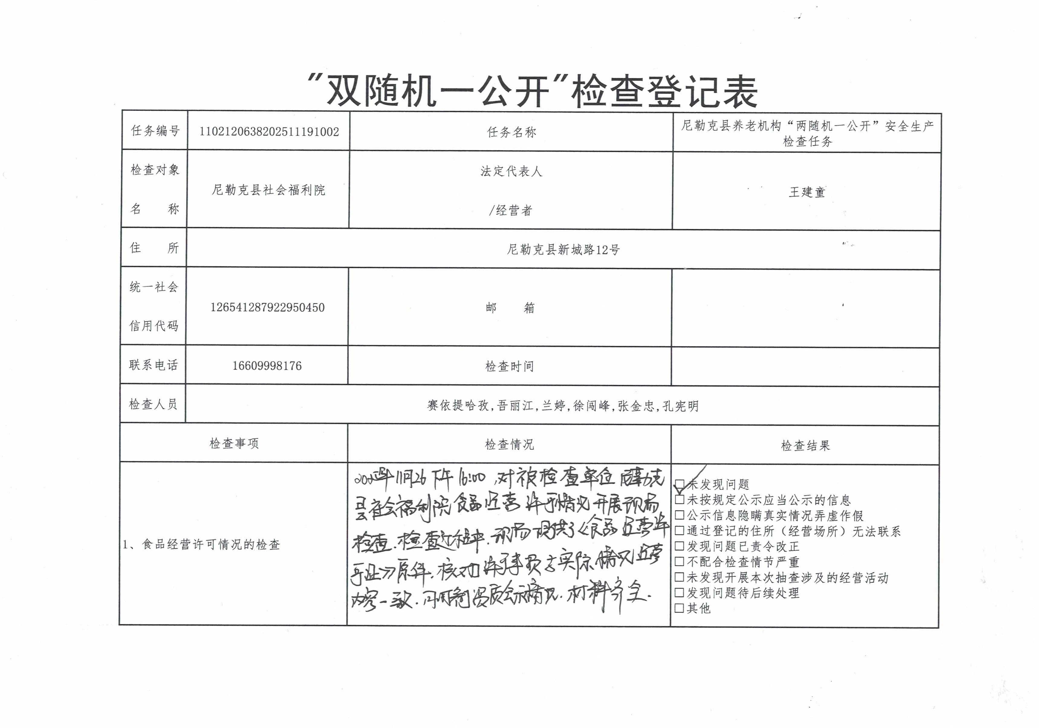 尼勒克县民政局养老机构“双随机一公开”安全生产联合检查结果